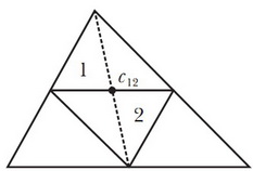 Четыре получившихся треугольника подобны треугольнику \(T\) с коэффициентом \(\frac{1}{2}\). Треугольники №1 и №2 вместе образуют параллелограмм, центр масс которого \(c_{12}\) лежит в точке пересечения его диагоналей (поскольку это фигура, симметричная относительно обеих диагоналей, а, значит, её центр масс обязан лежать на каждой из двух диагоналей). Точка \(c_{12}\) находится посередине общей стороны треугольников №1 и №2, а также лежит на медиане треугольника \(T\):