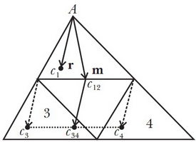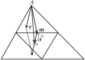 Пусть теперь вектор \(\vec{r}\) - вектор, проведённый из вершины \(A\) к центру масс \(c_1\) треугольника №1, и пусть вектор \(\vec{m}\) — вектор, проведённый из \(A\) к точке \(c_{12}\) (которая, напомним, является серединой стороны, на которой она лежит):